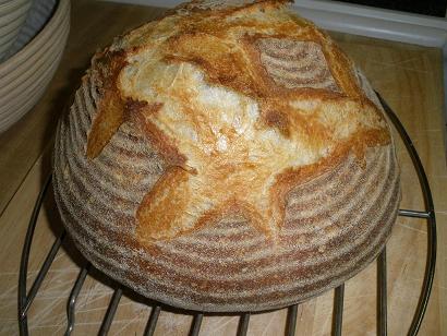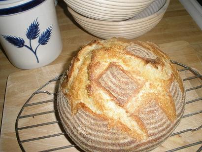 This bread had excellent oven spring and was yummy but not exceptional. A longer retarding time and a few other changes resulted in somewhat less dramatic oven spring but a much improved bread in both taste and texture which can be found here: