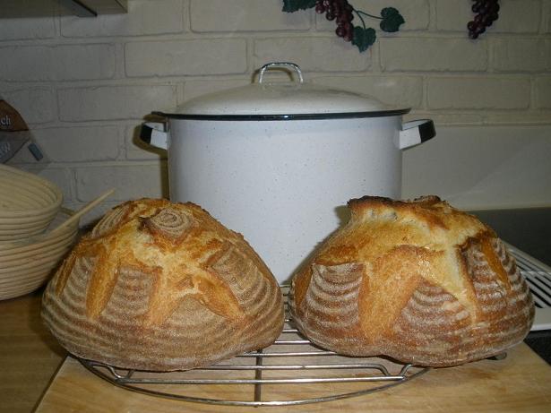 I could not resist trying to show these, as I am new to being able to post pictures directly to the forum. I usually bake my sourdough loaves on hot tiles with just parchment paper underneath, but I have been watching some videos on baking in a covered pot, and today decided to try it. I just took my first ones out of the oven. You can't hear it, but there is cracklin goin on...