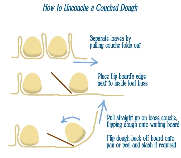 One thing to really be sure of is that your couche is well floured before you place the dough on it so the wet dough doesn't stick when you're trying to remove it. So rub in plenty of flour into your material. I've found that a mix of half bread flour and half rice flour works really great. Don't remove the flour from the couche when you're all done. Let it dry (it will have absorbed a little of the moisture from the dough) then carefully fold the couche, flour and all, and put it away. You won't need to add much flour next time.