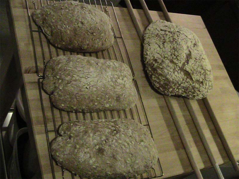 These are some pics of whole wheat ciabatta with fermented wheat berries and flax seed loaves I made the other day. I made them with a sourdough I started by using the leftover water from boiled potatoes, whole wheat, and white flour. The culture sprung up very quickly using this method. I wasn't originally intending to make ciabatta, but the dough was so wet i needed to fold it in flour and use a couche to keep it together. I only had enough room in the oven for three smaller loaves and one large monster that I proofed in a basket. Has anyone else used potato water in their starters? I have another culture forming now now using rye flour and potato water that looks quite nice.