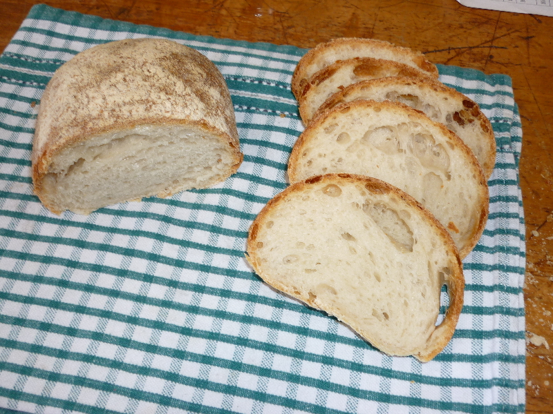 poured onto the floured bread board - lightly shaped - moved to parchment paper and let rise for about 1 hour while preheating a stone at the highest temp my oven would go to 500+ ( I have an old but much loved Comstock Castle restaurant range in my kitchen and I think the oven burner needs replacing. It was made in 1946 and the fins don't look so great anymore so the temp isn't very regulated.)