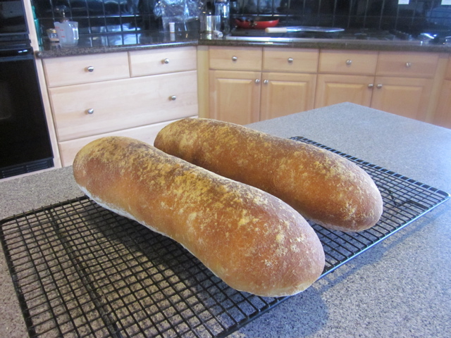 To get a darker yet still thin crust, bake with steam at a higher temperature. The formula called for baking at 450ºF. I baked these loaves at 475ºF. I was experimenting with Shiao-Ping's notion that the crackly crust comes from baking at a higher temperature and taking the loaves out of the oven without leaving them in the turned off oven to start cooling.