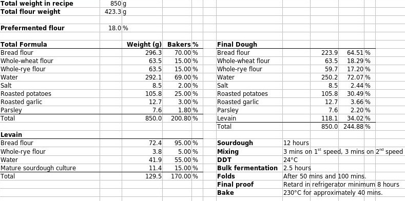 I put the formula together myself. It's nothing groundbreaking, but more a hybrid of the roasted garlic levain and the roasted potato bread from "Bread".
