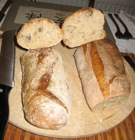 After reading the excellent recipe by Pat (proth5), posted by dmsnyder I thought i'd give these a go over the weekend and well, it must be a good recipe as even in my ham fisted hands I managed to turn out some very tasty bread, even if I need to watch some more shaping 'n' slashing videos! I varied it by using 300 grams of flour / 195ml eau (plus the rye starter) and made an overnight sponge with roughly 100g of the flour, starter and water the day before. The one on the right was baked 1st and was better, must have been the proofing en plastic guttering! I had thought i'd slashed it fairly deeply but the rise was quite impressive.