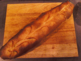 Anyway, the dough was a lot firmer than I'm used to and I'm thinking I might try an extra .25 cup of water to see what happens.  I transferred the shaped baguette onto a hot cookie sheet and that seems to have helped with oven spring.  This time the shaping was a lot better-- I took occidental's advice and dusted the flour with a sifter and that combined with how the dough was a lot more dry than what I've been using so I managed to shape a pretty pretty loaf.