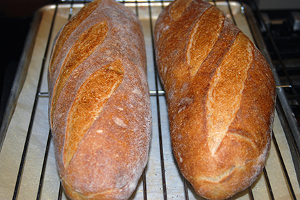 I had a little trouble getting the levain incorporated evenly and eventually ended up using my DLX with the hook installed to mix the dis-similar masses. I also mis read the proofing and after 45 minutes baked the first pair of loaves while the remaining pair waited in the cool garage.