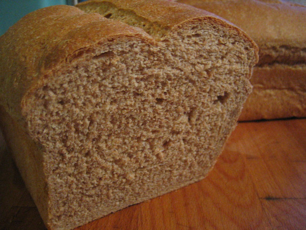 I've been messing around for a while trying to make the most tasty whole wheat sandwich bread.  I've tried PR's epoxy method, which is time consuming and results in low oven spring.  I've tried a direct-mix simple 2-proof method which doesn't develop a lot of flavor.  Last night I tried the Tassajara basic recipe, which has techniques I've not tried before.  First, you make a really wet sponge that rises for 45 minutes.  Then you add the salt, fat, and rest of the flour, mix, and second proof.  It calls for two more proofs after that before baking, though I just did one.  I was REALLY impressed with the oven spring, flavor, and strength of this bread.  Has anyone else used a wet sponge for whole wheat?  It seems like it strengthened and flavored the bread much more than Reinhart's method.  Here's what I ended up with: