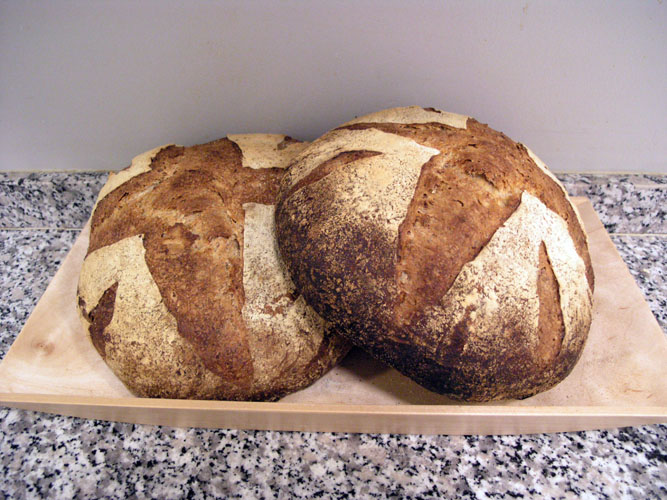 - Lightly flour the boules before turning them out onto a peel, slash as desired, place directly on baking stone. Repeat for 2nd loaf. Add 1 1/2 cups of water to your steam pan, close oven door. Turn oven down to 450F with covection and bake for 25 minutes. After the 1st 25 minutes, rotate the loaves between the stones and bake for another 25 minutes with convection at 425F. Loaves are done when the internal temp reaches 205F to 210F.