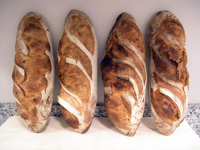 Just wanted to share with you my Big Bad Batards from my 2/22/10 bake.  These are approximately 850g-900g and 16" long.  They are big!  Some of the nicest looking breads I have made in while.  I could have let the bulk fermentation go a little longer and upped my hydration... These were about 70% hydration.