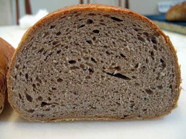 I made this bread.   It has a delicious taste, but has the same problem of being too dense.   I raised it around twice as long as what was listed - since it was expanding so slowly - I guess that's my cold kitchen.   I used a rye sour starter with the texture as recommended by Greenstein in his book, and first clear flour.    As well as following the recipe weights you posted carefully.   But both loaves seemed to collapse when I put them in the oven, and never really raised back up, which I think is what accounts for the density.   Does this indicate that I didn't let the loaves rise enough or could it be how I handled them?  Also, in the corn rye (rather than sour rye) Greenstein recipe also posted by you, I used a high gluten flour rather than first clear.   That seemed to rise better although that loaf was too dense as well and extremely wet prior to cooking.   You said above that the less dense, less even crumb is a factor of the wheat flour fully developing.   I'm not 100% sure what that means technically, but I'm wondering if high gluten is actually a better choice.   I have read that first clear is low gluten but I'm not sure that is right.