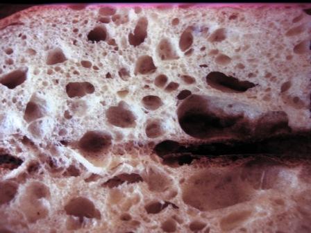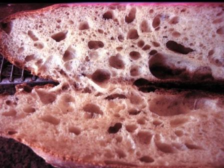 I was pleased with my slashes (despite the problems gas ovens create by venting steam), and the crumb was the most open I've achieved with his recipe.