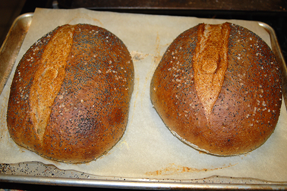 I cooked a 10 pound corned beef today and we had a New England boiled dinner. It's my start of the St. Patrick's holiday meals. Tomorrow will be the corned beef sandwiches on the Rye below. I have made this Deli style Rye a hundred times and just about every time I swear I ruined it and don't expect it to spring in the oven. When I open the door and see that nice puffy brown loaf I can smell the caraway and I just know I beat the odds one more time. That's the thing about rye, especially really sour rye that sat on the counter for 24 hours and the fridge for 2 days. It's been hectic around here and I didn't get to it when I had planned.This is evidence that even ugly bread can be delicious. I don't know WHAT I was thinking when I slashed these two. It certainly wasn't baking. These have a poppy seed and large crystal salt topping.