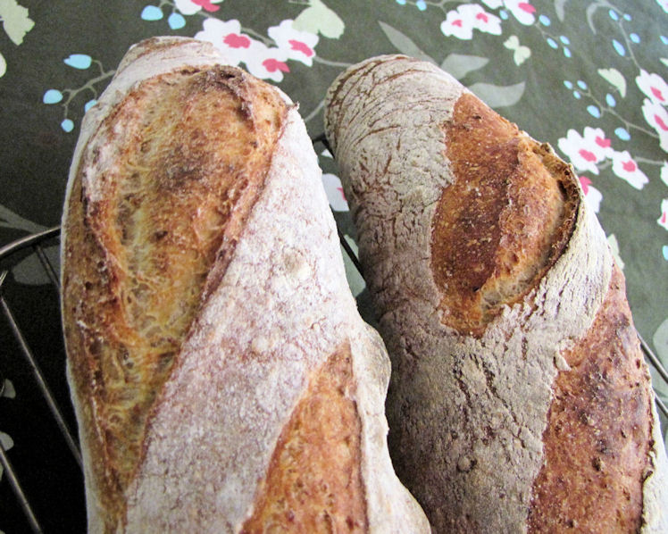 I've been playing with Susan (Wild Yeast) Norwich Sourdough and Floyd's San Joaquin sourdough on this site. I found the first too firm and sour, the second too slack and not sour enough, so I worked out my own formula...a happy marriage between the two. And lo and behold---ears for the first time ever (in a dough not cooked in a dutch oven). As it happens, I donated the bread for a friend's dinner party so no crumb shots.
