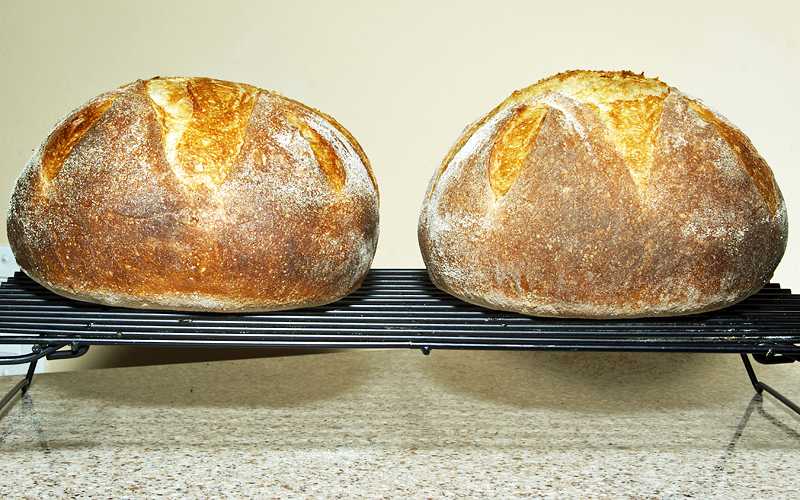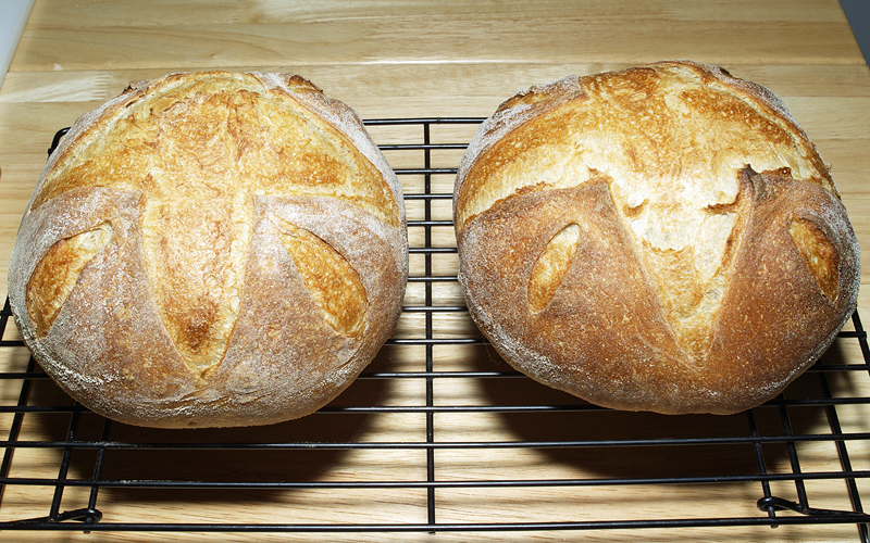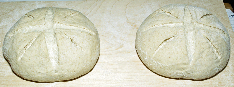 I made two changes: 1) I loaded the loaves simultaneously, and 2) I slashed the same pattern on both loaves.