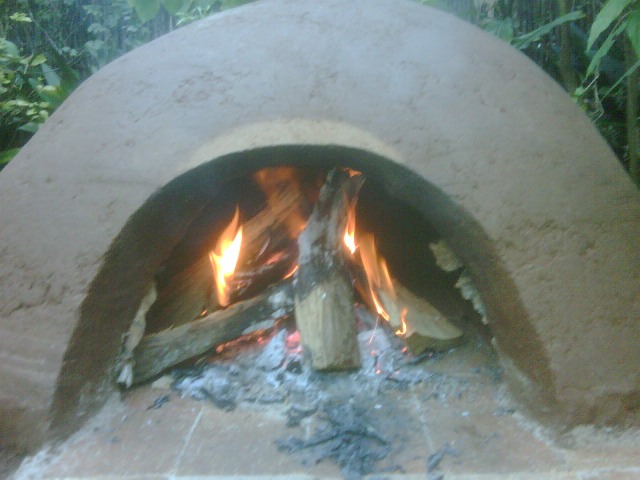Once finished with the oven it must be given sufficient dry time. Starting small fires inside the oven to provide warmth and to facilitate evaporation of moisture can quicken drying the oven. It is a good idea to use several of these small fires over a couple of days in the oven to help dry it out, especially if you live in a moist climate. We built three small fires in our oven to help get the moisture out before firing it to cook with. Our oven did experience some cracking in the dense layer however. The fix for cracks is to patch it up with material that is the same mix as whichever layer cracked. So, for our oven we used a 2:1 sand/clay ratio mix to patch it up, and it has lasted well through at least two hot firings. After these small drying fires it is time to begin cooking. With the oven itself completed, a door will need to be constructed to help keep the heat in while baking. The door is basically just a wooden plug that is fit to slide into the doorway of the oven. It can be covered with foil to keep it from burning, but some people find that when cooking it helps to drape a wet cloth over the door to let more moisture into the baking chamber."