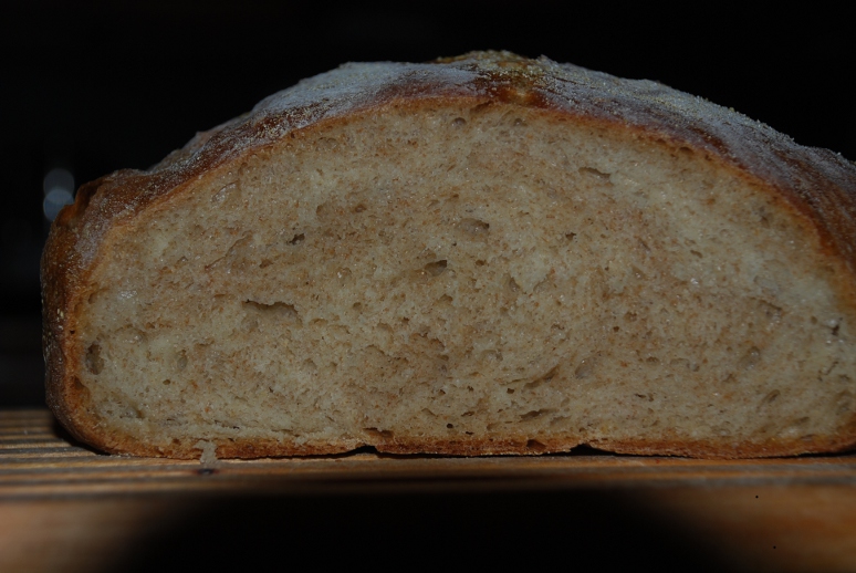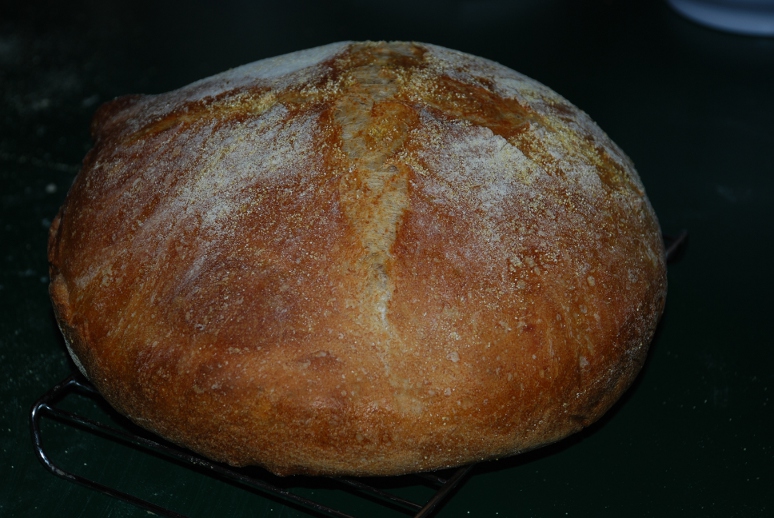 Today's bread is a pain de compagne. I used and modified Bernard Clayton's instructions for Madame Doz's bread. Compared to the milk bread I made yesterday, this is long and involved, with many steps that make the scheduling difficult, especially for a beginning bread baker, who generally can't hang around the kitchen all day. So I allowed myself more flexibility on the times than what Clayton specified, and looked more at the condition of the dough than the clock to decide if I could get away with going late or early on several of the steps. I have made this bread a few times already and this came out the best yet. It starts with a "starter" with flour, water, vinegar, buttermilk, and yeast (belts and suspenders?) that goes overnight. Then add whole wheat, water and wheat germ to that to make the levain, which hangs around on the counter for most of the day. Then mix up bread flour and water into a dough. Then merge the levain and the dough - balls of around equal size - into one big blended dough. The step that I really don't understand and haven't seen elsewhere, is that when the two pieces of dough are merged, only then do you add a solution of salt in water and work that in. Can't argue with the result though - even though this uses a fair amount of whole wheat flour, it still comes out very mild and light. Although Clayton's total kneading time is around 20 minutes, I tried to do as little as I could and still get the dough mixed up, so as to have more of an open crumb. I baked this in a dutch oven instead of on a stone with steam, removing the top for the last 15 minutes.
