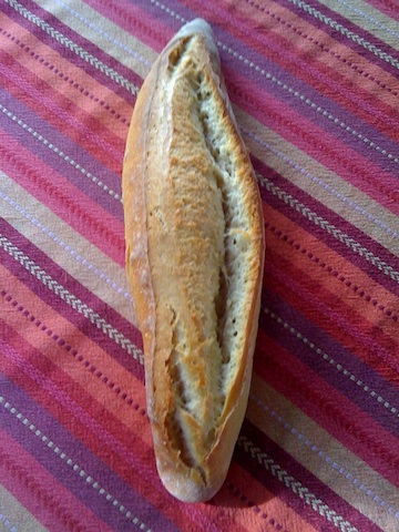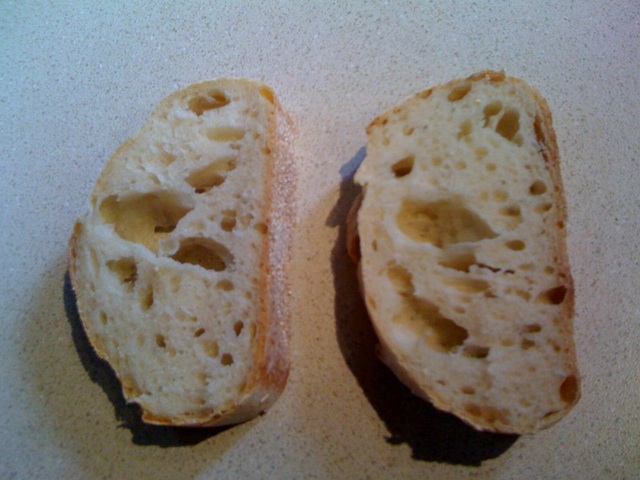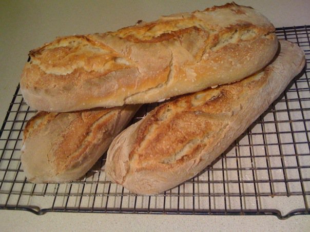 Compare the above to the below, which I produced from the same recipe using the pan/water steaming method: these loaves have open scores, but with blow-outs and a dense crumb (don't have crumb shot):