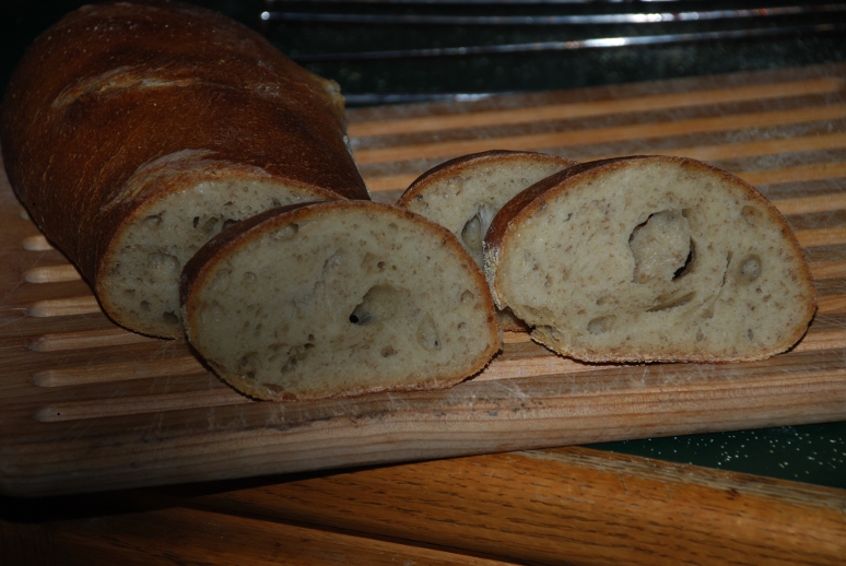 Inspired by the beautiful pictures of Hamelman Pain au Levain 5% Rye posted by Larry, I decided to make it. I knew that this would be tough, given my experience level, but I figured I might as well give it a try. I started yesterday with making the levain. It calls for old levain, which I didn't have, so I decided to use the sourdough starter that I've been tending for the last few months even though it is made with White Whole Wheat, for the two tablespoons of old levain that the formula calls for. There must be another way to do it, but since Hamelman didn't say what it was, this was all I could think of. Today, I realized that this bread requires A LOT of attention. I postponed a number of activities that I had been planning on, so I could give it the proper attention and not screw up the timing. When it came to pre-shaping and shaping, I read Hamelman's tutorial several times so I wouldn't forget what I was supposed to do in the heat of the moment and start ad-libbing. I did the final rise with rolled up towels to hold the shape (someone on this list - Dillbert? - suggested that for those who are coucheless.) The final rise was listed as 2-2.5 hours, but the fingertip test passed at around 1.5 hours, so I decided that was decisive. I scored with an exacto knife (which turned out to be a mistake, since it wasn't sharp enough, and I popped the two loaves in the oven apparently (another mistake) too close together given how much they had left to rise. So here they are - nothing as beautiful as Larry's but I'm just as pleased as I can be. And maybe after another dozen tries or so, these will look as good as they taste.