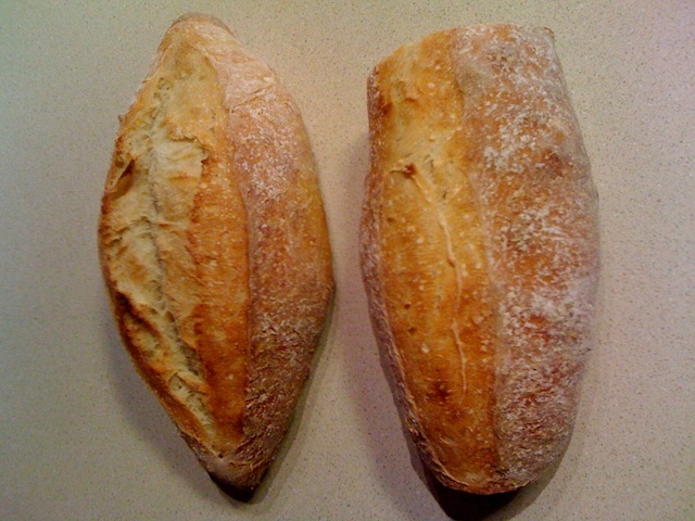 The loaves below were shaped and scored identically. The loaf furthest away from the steam (the one with amputated heels) did not open up at all, in contrast to the loaf closest to the steam opening up nicely. Given the unequal results, I will go back to my former steaming method.