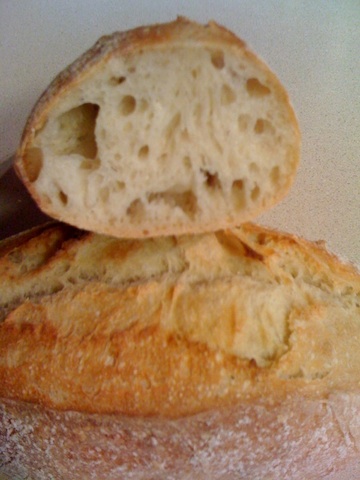 In my continuing quest for a more open crumb, and after much help from everyone here, I was quite pleased with today's results. I used the KA tangy sourdough recipe, unbleached AP flour, all room-temp ferment (versus part cold/part room temp), and two stretch-and-folds during the second ferment.