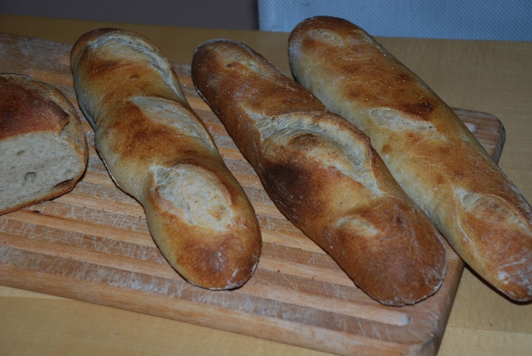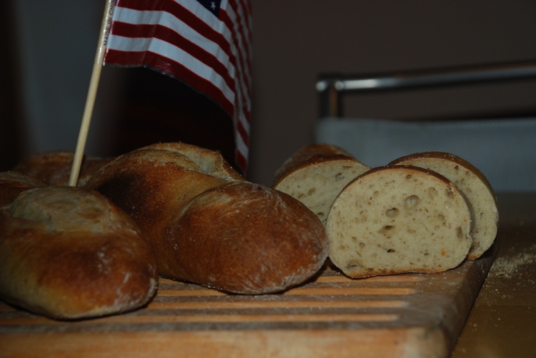 Recently I have been experimenting with making sourdough multigrain breads. My first attempt had 50% bread flour, 25% spelt, and 25% rye. Suffice it to say, I hope our friendly neighborhood coyote didn't break a tooth on it. Yesterday, I went down to 6% spelt, 6% rye. This wasn't bad. Today, I went down even further and made baguettes with 3% rye, 3% spelt. This was downright tasty. Here they are with a flag in honor of Patriot's Day.