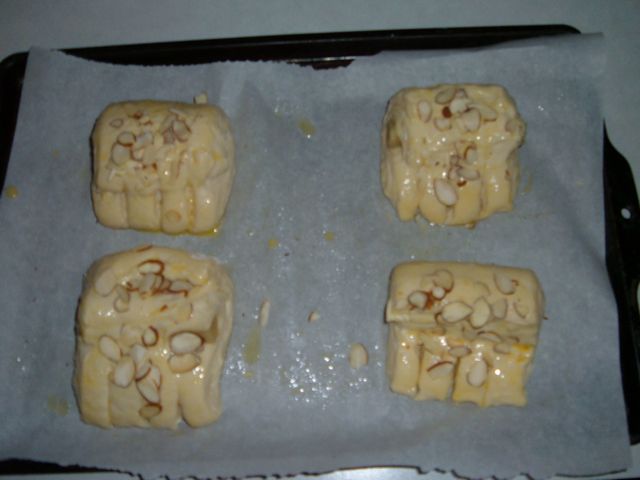 Here is my laminated dough all rolled out with a log of Almond paste. I tried to make the squares 4" x 4", next time I will go with 5x5 or 6x6.