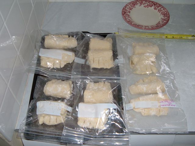 After the croissants were shaped I eggwashed and proofed them for three hours, and began shaping the pains au chocolat. I used two chocolat batons (I use the less expensive Callebaut, rather than the Valrhona DonD prefers - I figure I'm on training wheels here, so I'll work up to the really good chocolate) per pain, and also allowed them to proof for 3 hours after an eggwash. At the end of the proof I proceeded to freeze both batches (see below).