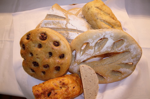 There were always minimum of four breads can include: lemon, tomato, olive, bluecheese & walnut, pain de campagne, savoury brioche, focaccia, fougasse aux lardons, plain white, 50/50 wholegrain.