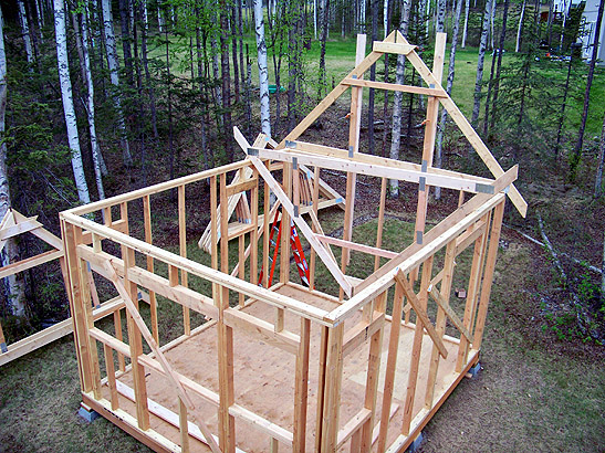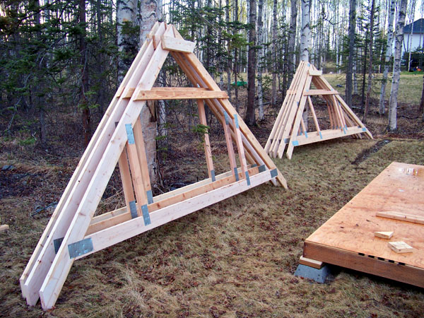Good deal -- that works so much easier when you don't have a floor deck to worry about and are only trying to maneuver 2x6 trusses :D Our 2x12 gambrel trusses for the 16'x24' cabin were so heavy that we actually had to built them on the loft floor and stand them up one by one using the tow strap and truck winch to help lift them off the deck... in December. You're so much smarter doing construction in the summer LOL