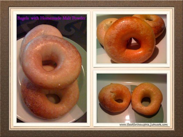 I'd say this looks more like bagels. The previous ones were a little too small. 4 oz are the right size. I also used a homemade malt powder, tried to sprout my own with wheat berries. Soaked for 3-4 days. There was a little white sprout, but somehow didn't like the ones in Dan Lepard's book on The Homemade Loaf. But I went ahead to dry and grind it then. I added in this ingredient, but still without malt syrup, I substituted with brown sugar. The colouring looks fine I guess.