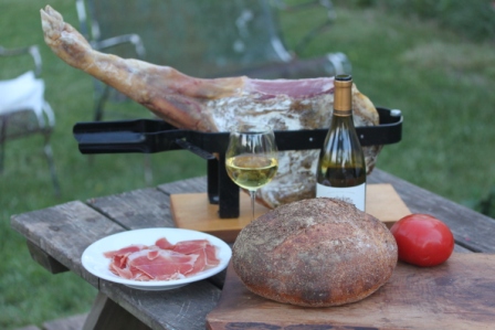 This past Friday, we took off from work early and drove down to Luca's house just in time for an Al Fresco dinner in his backyard with his family, his assistant winemaker Daniele, Domenico Zonin (eldest son of Gianni) and Christophe, a visiting French Wine Consultant. In anticipation of this get-together, the day before, I had baked a Pane Casareccio di Renzano loaf from Daniel Leader's 'Local Bread' to go with a whole Prociutto ham made from the leg of a pig named 'Spike' that was raised for a caterer friend and that I had cured for almost two years. The weather was gorgeous, the fellowship was excellent, the morels were plentiful, the wines were flowing and the prociutto and bread were not bad either.