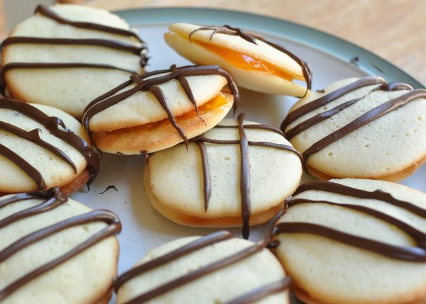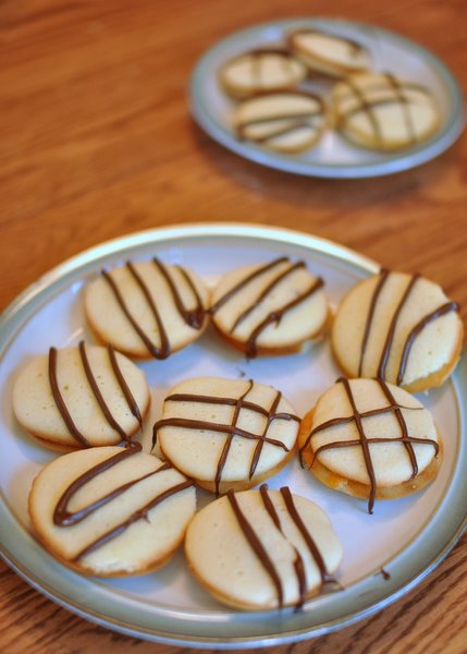 These cookies put my pathetic piping skills and equipment (Ziploc bag with the tip cut off) through their paces. Wildly uneven cookie sizes and really poor piping skills do not do these cookies justice. They are delicious, though -- don't let their kindergarten looks fool you.
