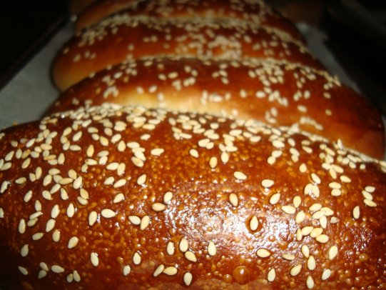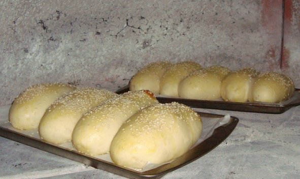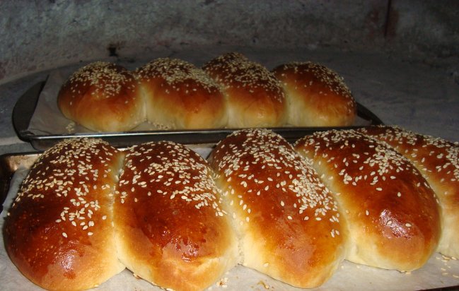 I'm so glad you enjoy the buns as much as we do.  They are nice because of the amount of butter in them and pull apart in stretchy flakes and even better the the next day, like most breads.  These photos were taken in a pitch black oven at night.  I have an outlet nearby and just keep forgetting to pick up a lamp at the hardware store.  It would make things easier than using a flashlight.  I tried something a little different because I wanted the oven to cool down quicker from having it fully heated for my pizzas.  The pizza's were perfect...I've got that part of the oven down just right.  I left the door off, before the buns in, to cool it down quicker, I wanted to get to bed earlier.  It affected the floor causing it loose more heat than I wanted...probably from the cool night air entering across it,  the buns would have browned more on the bottom had I left the door on while it was cooling.  I did learn something about my ovens heat stabilization.   I rotate the pans to get even browning.  They have added flavor because of the long proof in the refrigerator...do try this!  These were a little overproofed after taking them out of the frig. for over an hour.  They will be very nice when toasted and filled with hot dog fixings.  I don't eat hot dogs but maybe a couple of times a year.  I like the Hebrew National Kosher brand...any other suggestions are welcome!