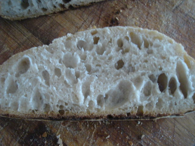 I tried to incorporate all the advice from my previous post into this bread and the result was remarkably better! As you can see from the photo's, the color is nice and golden,, the crust is nice and chewy and the crumb is very soft and tasty. The distribution and size of the holes was also much better. Because my dough got stuck to the proofing baskets, I cannot for sure say that the proofing time was the initial problem, but after 3 hours of proofing, then knocking it down and then proofing it again for 2 hours seems to have helped. I am however still convinced it was due to a short and cold proofing period, along with two very important factors: Not enough steam and not enough heat from beneath. The bread is not perfect yet but I will tweak this method until I come close.