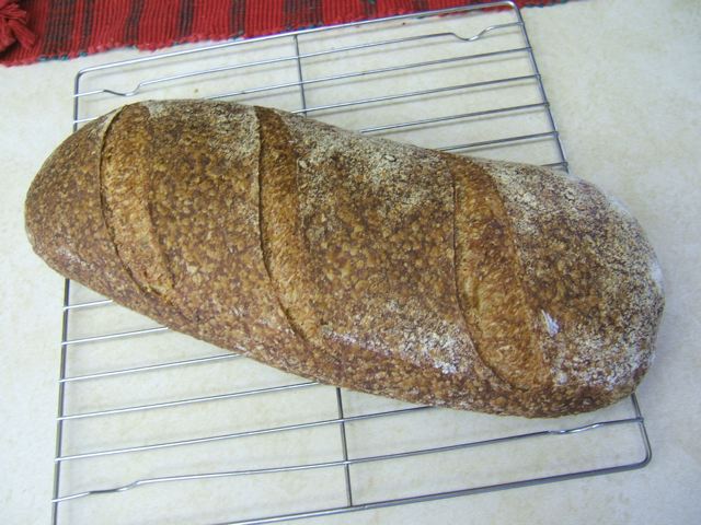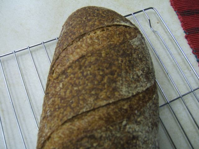I think I managed to compensate for the new environment and make a fairly reasonable batch of whole grain sourdough baguettes (about 40% whole wheat flour, with what my mother in law calls "Porridge Oats"--oats with other assorted mystery grains and seeds).