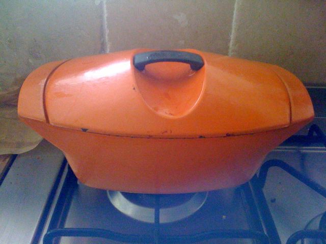 It has been quite awhile since I've baked much of anything, particularly sourdough, as since getting pregnant in March I've found the smell of the sourdough and the thought of making it completely nauseating (which is bizarre seeing as I was totally addicted to it before getting pregnant, and baking everyday.  Or maybe that is why....)  Anyway, this pregnancy has seen the nausea last an unreasonably long time, so only in the last few weeks have I felt inclined to get back to baking.  When I was baking regularly earlier in the year, I deliberated over the available options for a dutch oven, and really wanted to get one, but did the usual thing of researching myself to exhaustion then forgetting about it for awhile, and so I never got around to buying one.  I live on another continent than my mother, so when she comes to visit we make a point of getting out together without the children at some point for some rummaging through charity shops and vintage/antique stores (something I don't get to do much on my own without someone around to leave the children with and someone to go shopping with!).  We were on our morning out and I mentioned that I'd really like to buy a dutch oven, but hadn't thought about it for awhile, but if we happened to see one I would definitely want to get it.  Imagine our delight to spot a bright orange, rectangular enameled cast iron lidded dish in the window of a really great vintage shop along our wander!  For a moment I thought that the handle might be plastic, but it turned out to be metal, so we snapped up the bargain, at a paltry £10.  After bringing it home and giving it a little wash, I looked carefully at the faded name inside the lid and could just make out "Le Creuset" and "France" and the number 35.  Le Creuset!  I was pleased enough to have a genuine Le Creuset cast iron pot, but even more incredible was that it turned out, with some research to be from the original line of Coquelle pots designed by Raymond Loewy, and I found a black pot of exactly the same model listed on a website for several hundred dollars!