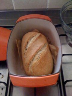 So, all in all, a fantastic find!  But to the really important bit, how my first loaf came out!  Can't take a crumb picture (sorry!) because the loaf is for my father-in-law, but you can see it has lovely crusty ears and (you can't see) a lovely crackle all around after cooling down.  I am totally thrilled with my new piece of bread baking equipment!