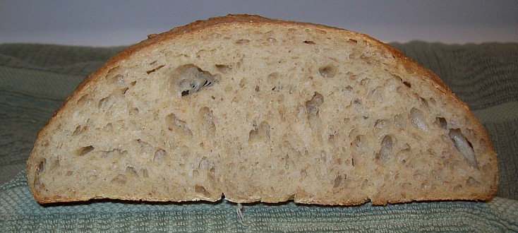 After that sequence is over, let dough rise about 90 minutes, then preshape, rest, and shape before placing it in a long basket with a floured tea towel. Proof about 3.5 hours at 75F, at which point it should pass the spring-back poke test. Load loaf onto a peel, then place onto the baking stone. Bake and steam at 500º F for 5 minutes, covered with a roasting pan. Reduce heat to 450º F and continue baking another 15 minutes or until internal temp is about 210º F. Cool, cut, and enjoy.