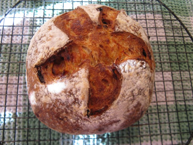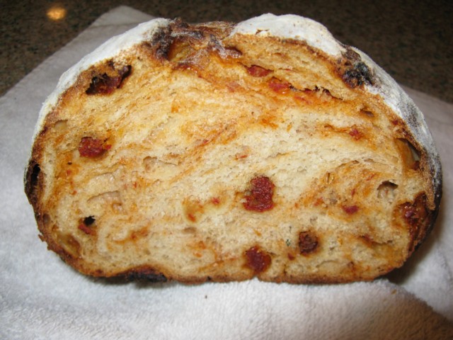 I will post again with more info re: the recipe. This loaf tasted really good and I can't help but think any white/whole wheat dough, sour or not, would taste good with the tomato and cheese additions! I used sun-dried tomatoes which were packed in oil, which I drained before chopping; they were nice and soft (and flavorful!) and didn't require any pre-soaking like dried ones would.