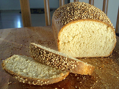The unshaped dough I punched down, shaped, and placed into a greased pan. I sprinkled on more water and sesame seeds instead of the egg wash that Hensperger recommends on this bread, covered it with plastic it, and set it aside to rise.