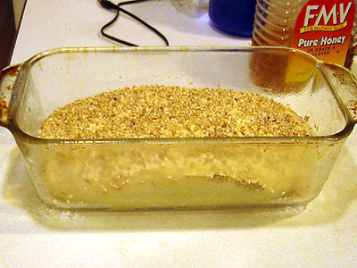 Beth says to mix the active dry yeast with the water and sugar and let it sit for 10 minutes until it becomes foamy. I didn't have active dry yeast around, so I used bread machine (instant) yeast, which doesn't need 10 minutes to activate. I simply mixed the water, the yeast, and the sugar together and then proceeded to add the buttermilk, melted butter, and honey. When they were thoroughly mixed I added the salt and 3 cups of the flour.
