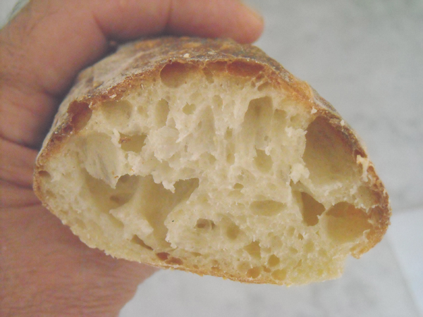 You were sharp to spot the somewhat dense crumb. That resulted from a departure from my normal method: I folded the dough several times before dividing and pulling it. Should have just let the dough settle on the counter, plumped it up to the correct height, and cut away.