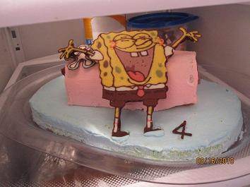 This SpongeBob cake was for my daughter's 4th birthday. The pink and light blue spongecake was Gary. (SpongeBob's pet snail) SpongeBob's left arm was broken because I didn't put enough chocolate on the back.
