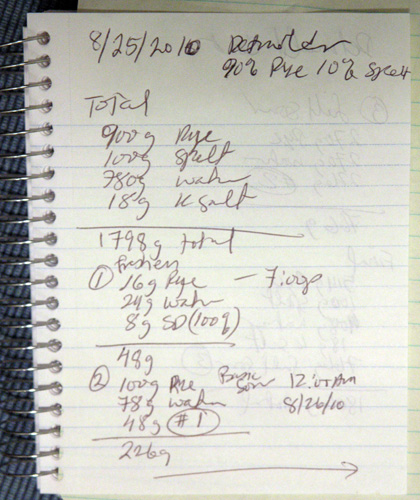 Wanted to share with you something that I have been working on for the past 2 days or so. I was poking around my local Gristede's supermarket the other day and found Hodgson Mills Stoneground Rye Flour for $5.99. I usually only go to Gristede's if I'm lazy or desperate as there are much better places to get groceries in NYC. Anyway, I was pleasantly surprised to find what I did. Also, I have some organic spelt berries that I'm trying to get rid of or use as it's not my favorite grain. So, when I got home I consulted Hamelman's Bread book along with the Hofpfisterei München website looking for some inspiration. I found the following. If you click on the links on their website as follows: Sortiment => Natursaurteigbrote => Pfister-Oko-Dinkel-Grunkern-Volkorn... It's a 92% spelt(dinkel) and 8% rye(roggen) bread... I was inspired by this, but did the complete opposite and thought it was a 92% rye bread... Anyways, my inspiration doesn't need to be correct, right?