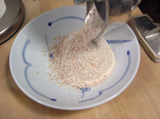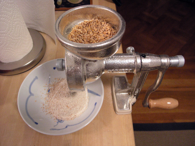 Hand grinding spelt grains for final dough with a hand crank grain mill