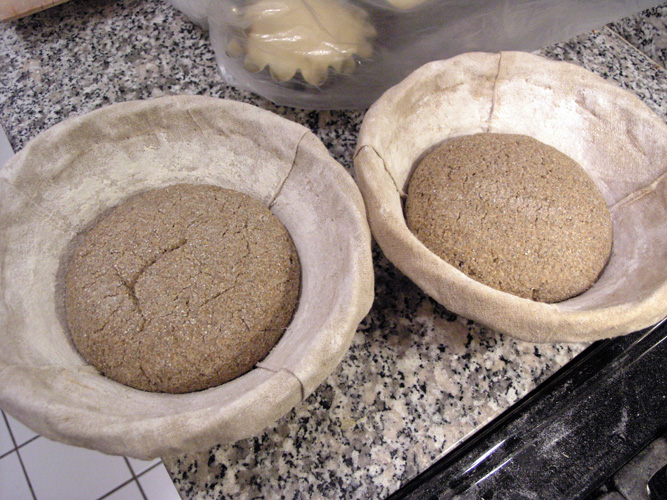 Just took a rye/spelt/ bread flour combo out of the oven and it is cooling. It seemed rather fast today. From 700g of flour 100g was spelt and another 100g was bread flour. The kids love hemp seeds (and I like the fiber it adds) in the dough along with sesame seeds. I tried out a new grass banneton. Mine was a bit wetter with 600g water. I'm wondering if a hydration between our two loaves would be about right.
