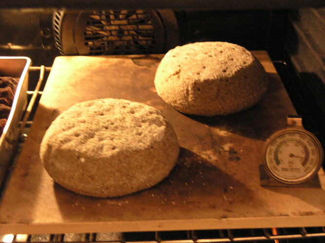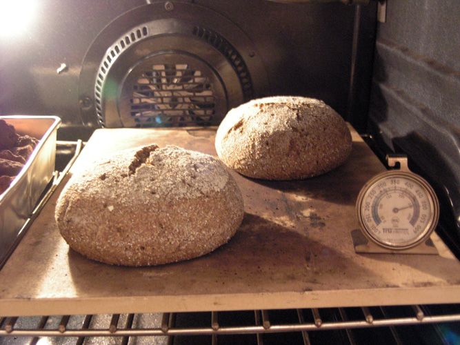 10:50pm - Turn off convection. Place loaves directly on baking stone, add 1 cup water to steam pan, close oven door. Turn oven temp to 500F and bake for 10 minutes without convection. Then remove the steam pan, turn oven down to 410F and bake for another 60 minutes or until internal temp of loaf reaches 205F or more. Sorry for the blurry shot...