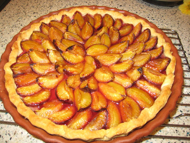 I love this tart. The fresh prunes are simply tossed with a little sugar (1/3 cup) and then baked in a tart shell for about 50 minutes.