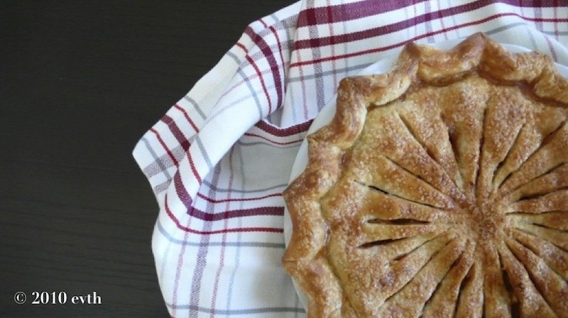 To briefly sum it up (click on above link for the entire recipe), Rose's way is to first, let the seasoned apple slices sit in their juices. Next, drain them and keep the juice, cooking it down with butter. Finally, mix it all in with the slices and pour the filling into the pie shell. After you top it with the other half of the crust, crimp the edges. *Here's a variation I made to the recipe: brush the top crust with a lightly beaten egg (egg wash) and give it a sprinkling of raw sugar (e.g. Washed Raw, Turbinado or Demerara). Place the pie in the refrigerator for about twenty minutes before baking it in the pre-heated oven (425°F) for 45-55 minutes - baking time will depend upon your oven's temperature and any hot spots. Good tip from Rose: bake the pie using a pizza or bread stone on the bottom rack of the oven. Place a baking pan/sheet between the pie and the stone to guard against filling overflow. The stone ensures that the bottom crust is baked through – crispy and golden! *If you are using a glass or ceramic pie pan, and you are worried about it cracking or breaking after placing it on the hot stone, make sure the baking pan/sheet is at room temperature before placing it underneath the pie pan, or you can just forego chilling the pie altogether. Keep a foil ring handy in case the pie edges brown too quickly.