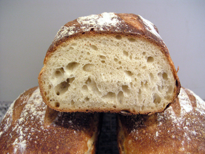 So I was up really late waiting for some Pain au Levain to rise...  Maybe a little too late, which is why I don't feel so hot right now and should be getting to bed early...  Way, way before 2:00am like this morning...  Anyway, just wanted to share with you some Pain au Levain in a pan that I baked very late last night...  They turned out really well, but I should have used smaller loaf pans...  Enjoy!  Recipe and method will follow the pics and the obligatory crumbshot...  Also, this recipe was inspired by one of the Pain au Levain recipes in Le Pain, l'envers du decor by Frédéric Lalos.